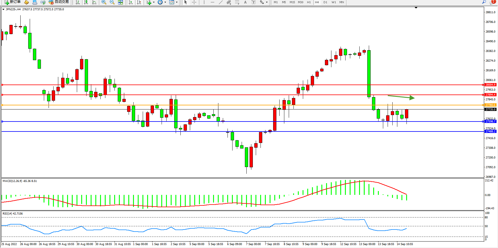 日经指数JPN225——4小时K线图显示: