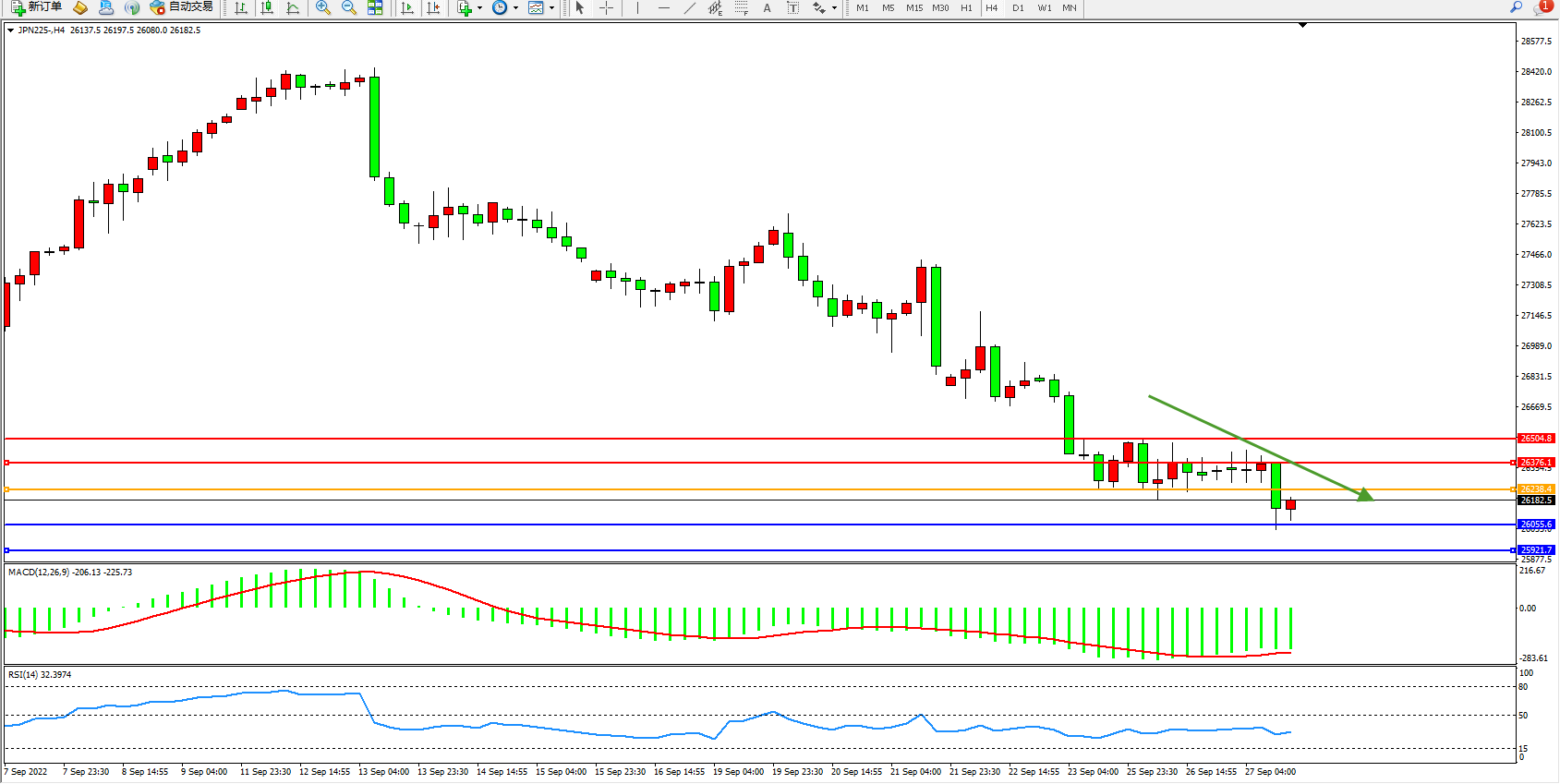日经指数JPN225——4小时K线图显示: