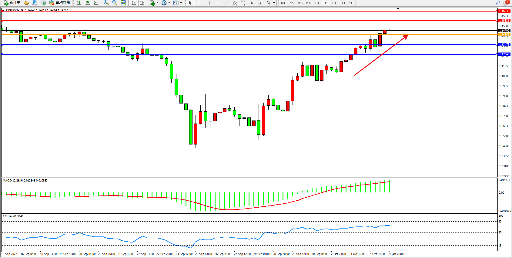 英镑美元GBPUSD ——4小时K线图显示: