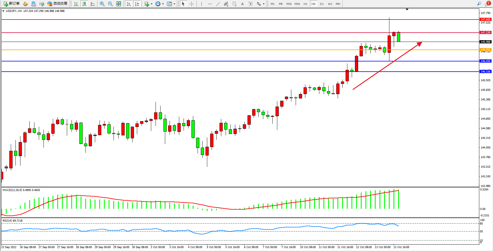 交易策略:146.762上方看涨,目标147.239、147.605