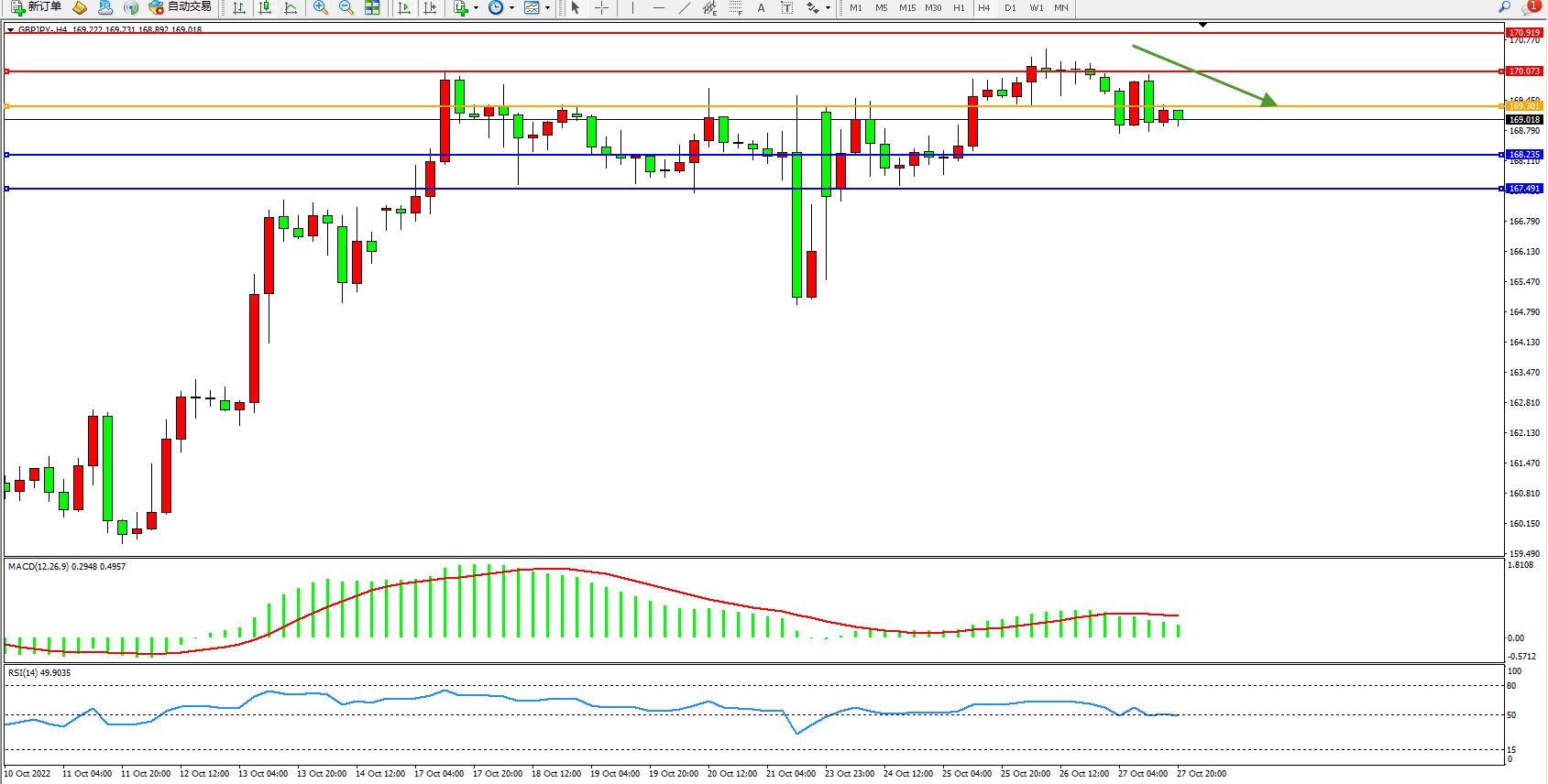 交易策略:169.301下方看跌,目标168.235、167.491