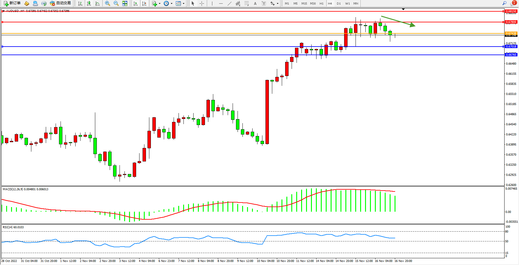 备选策略:0.67438上方看涨,目标0.67800、0.68150