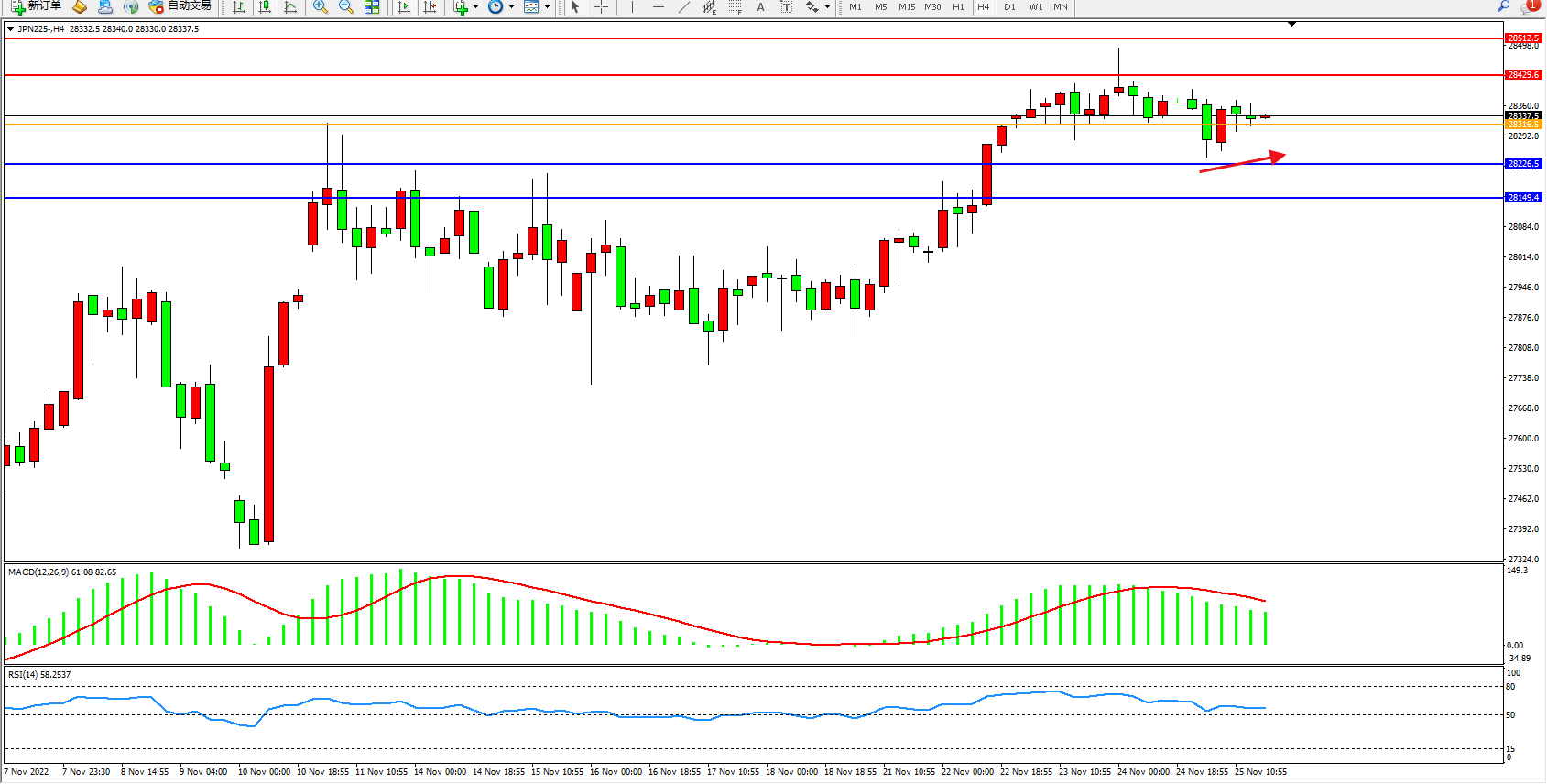 日经指数JPN225——4小时K线图显示:
