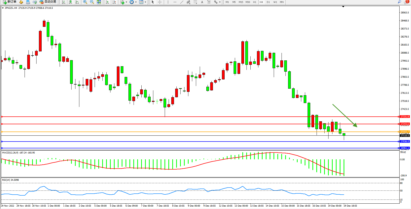 日经指数JPN225——4小时K线图显示: