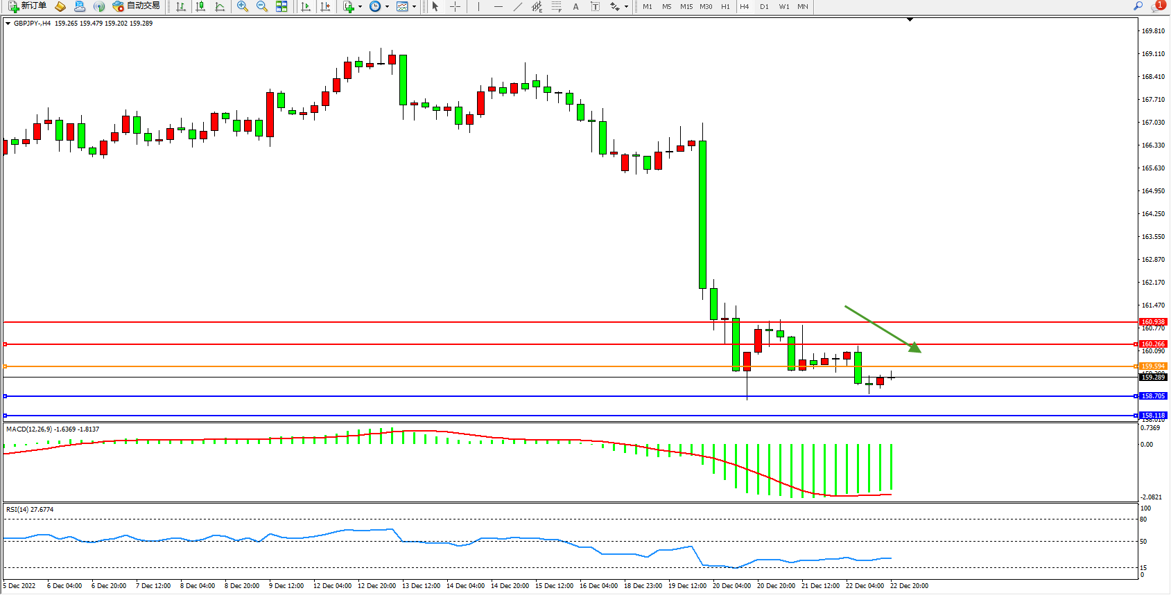 交易策略:159.594下方看跌,目标158.705、158.118