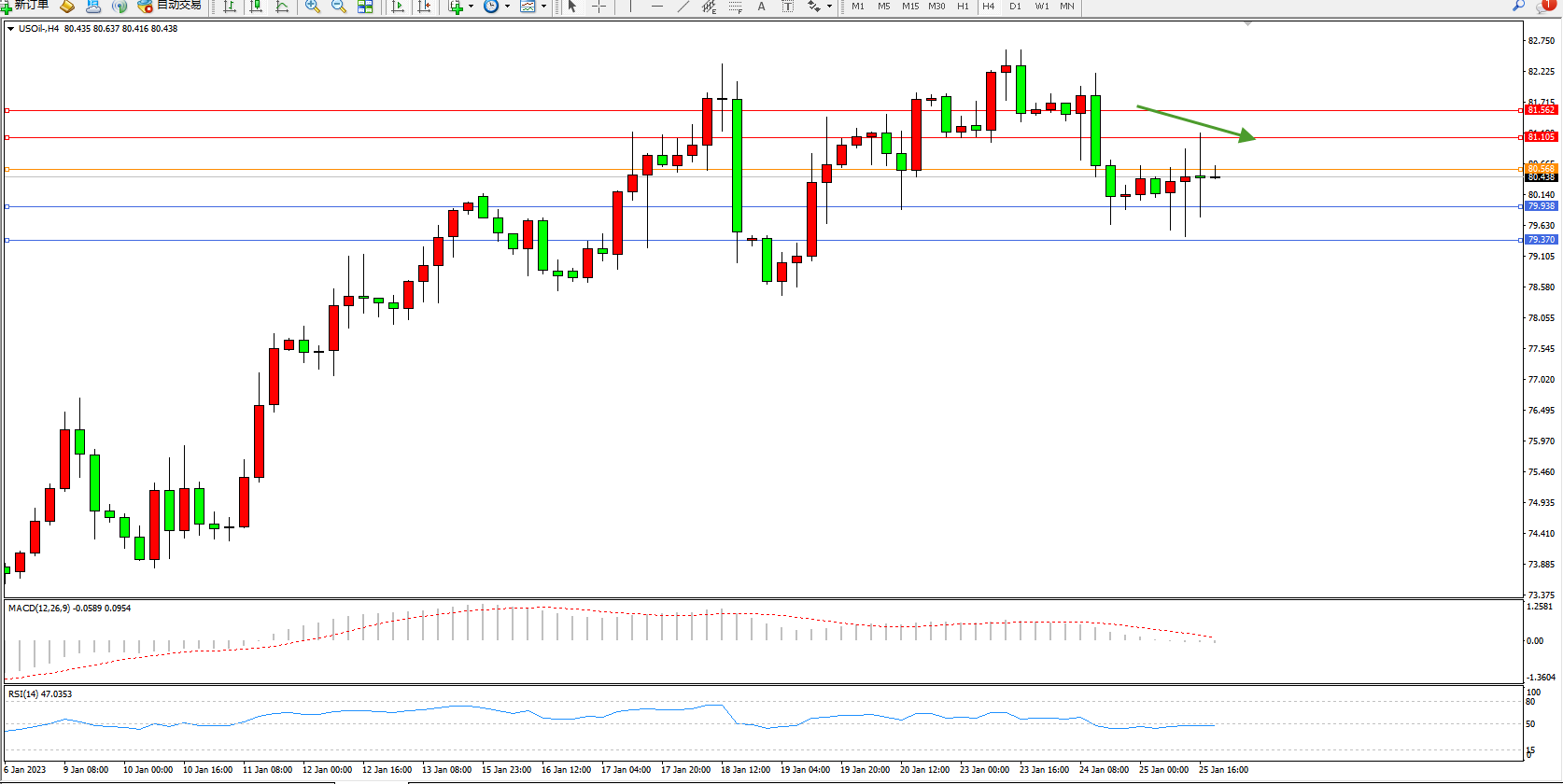 交易策略:80.568下方看跌,目标79.938、79.370