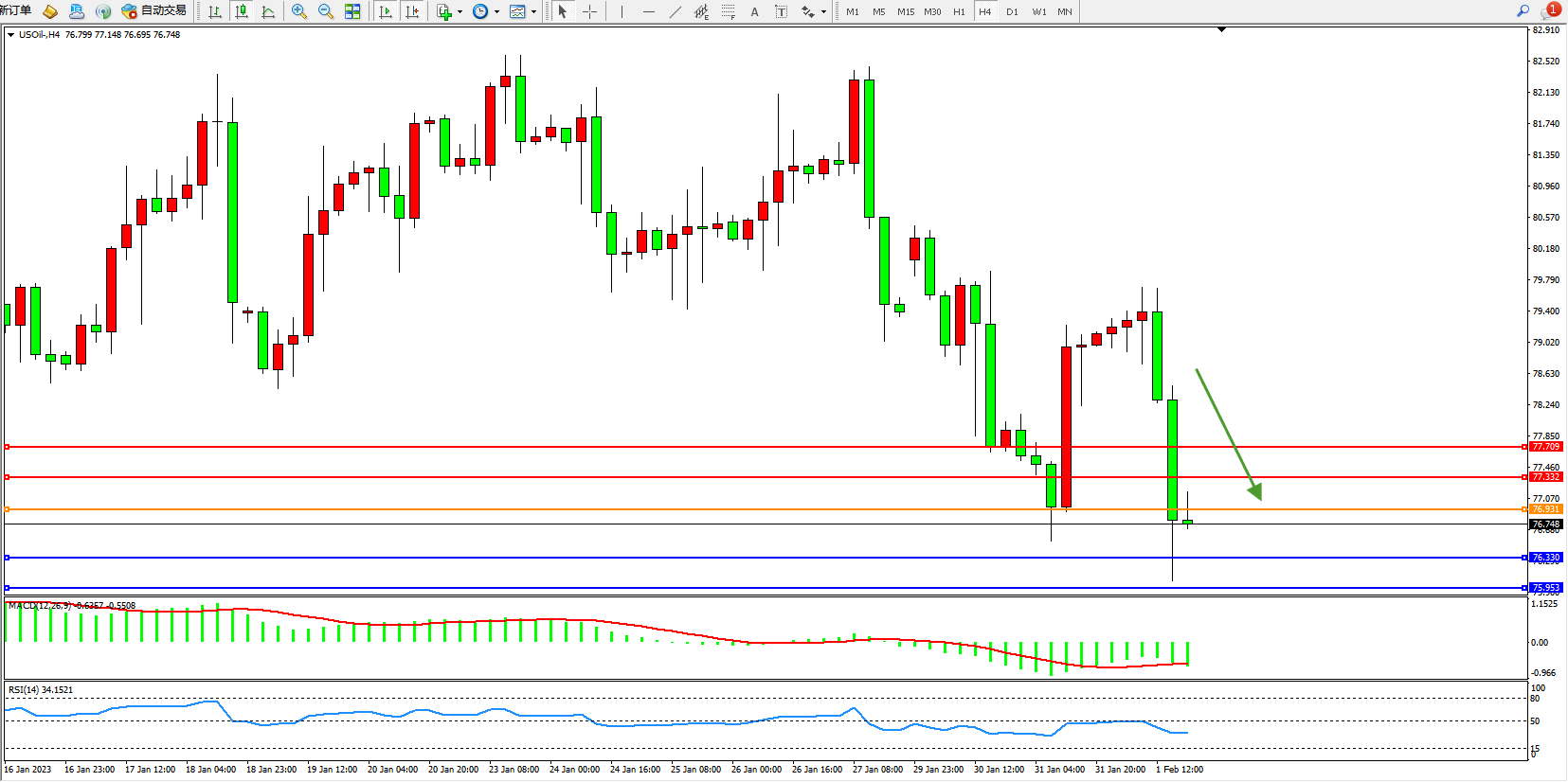 交易策略:76.931下方看跌,目标76.330、75.953