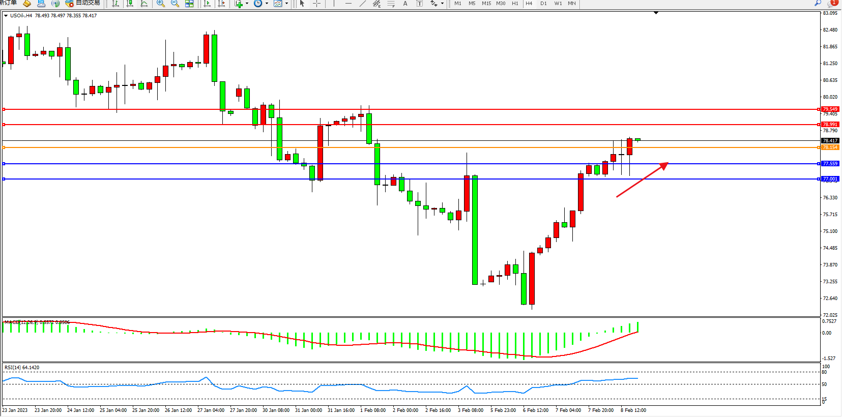 原油USOil——4小时K线图显示: