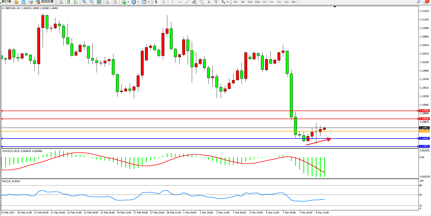 4小时图看:低位窄幅整理,市场整体处于看涨情绪,短期缓慢向上移动,MACD指标处于空头区域低位整理,RSI指标处于空头区域徘徊;