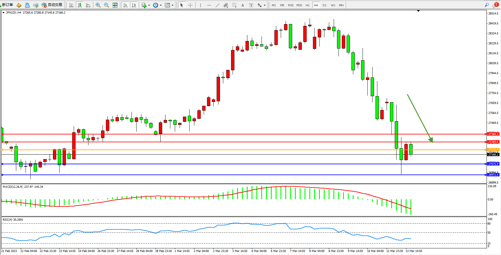 日经指数JPN225——4小时K线图显示: