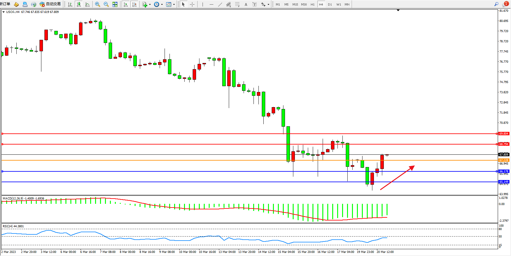 原油维持67.809附近震荡,市场担忧银行业危机会发展成全球金融海啸,进而拖累原油的需求,美原油很快回吐涨幅并延续跌势。