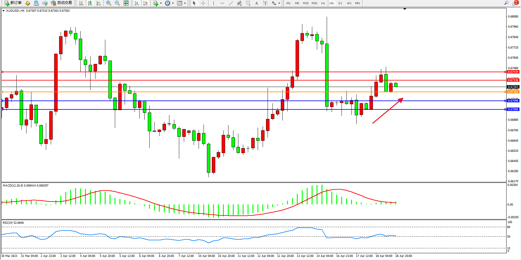 交易策略:0.67202上方看涨,目标0.67336  0.67434