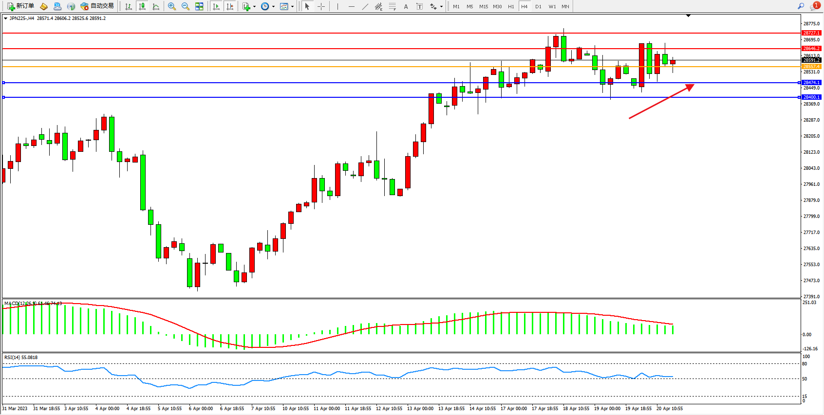日经指数JPN225——4小时K线图显示:
