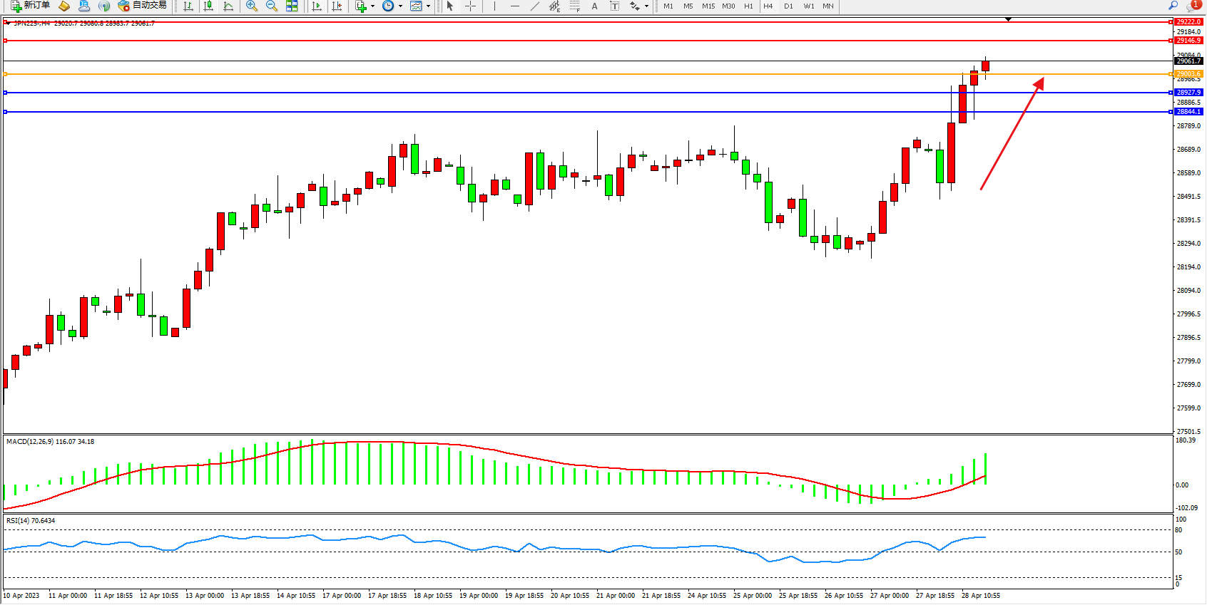 日经指数JPN225——4小时K线图显示: