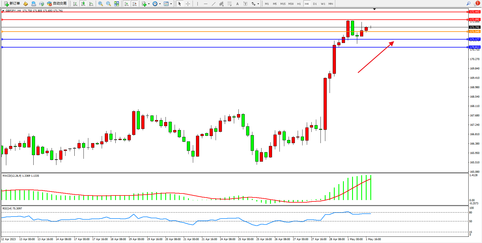交易策略:171.540上方看涨,目标172.092  172.443