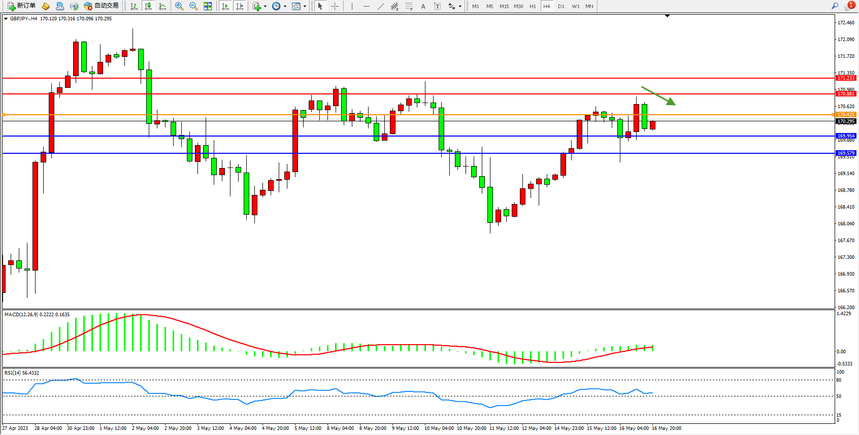 交易策略:170.425下方看跌,目标169.954 169.579