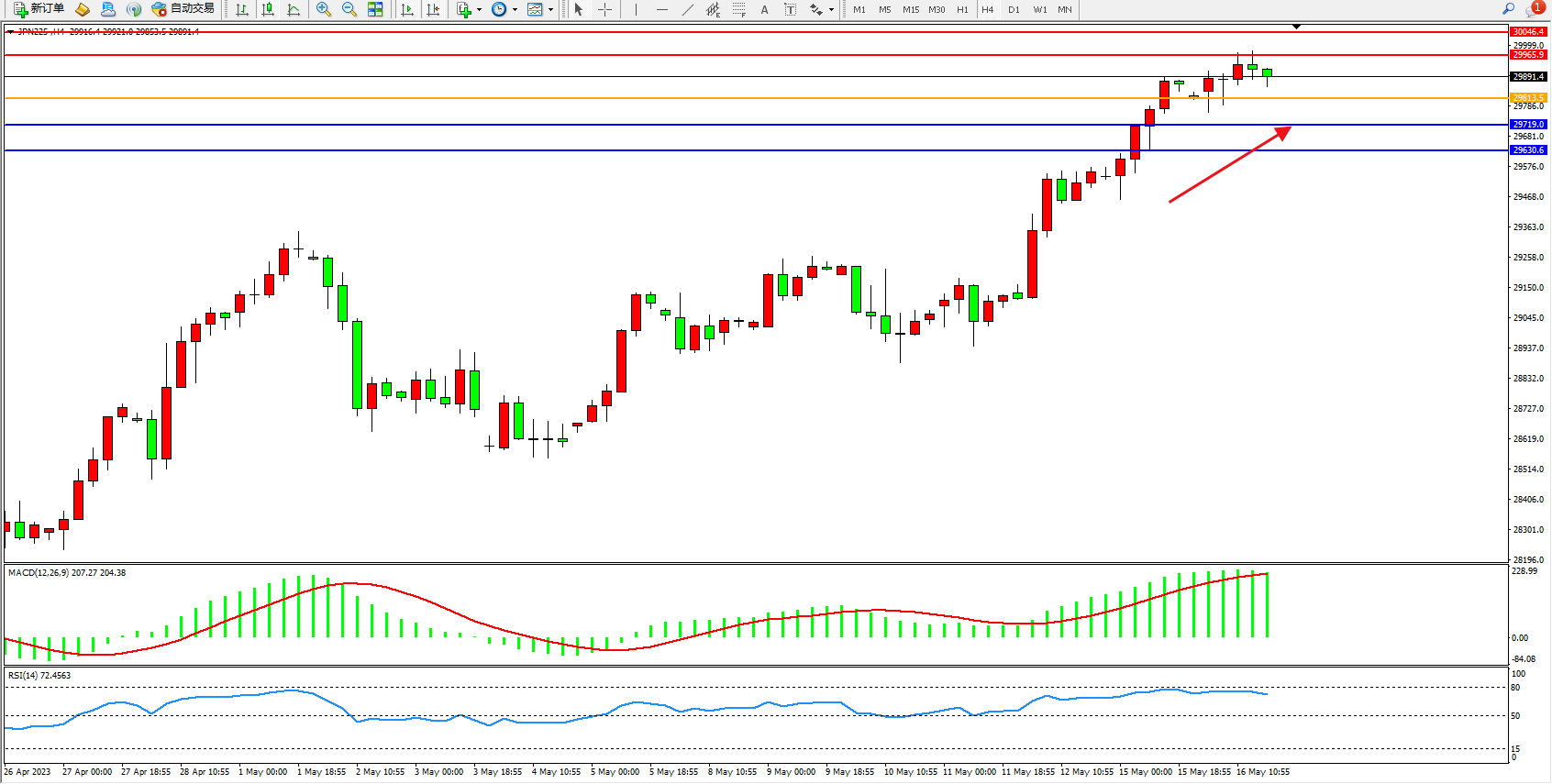 日经指数JPN225——4小时K线图显示: