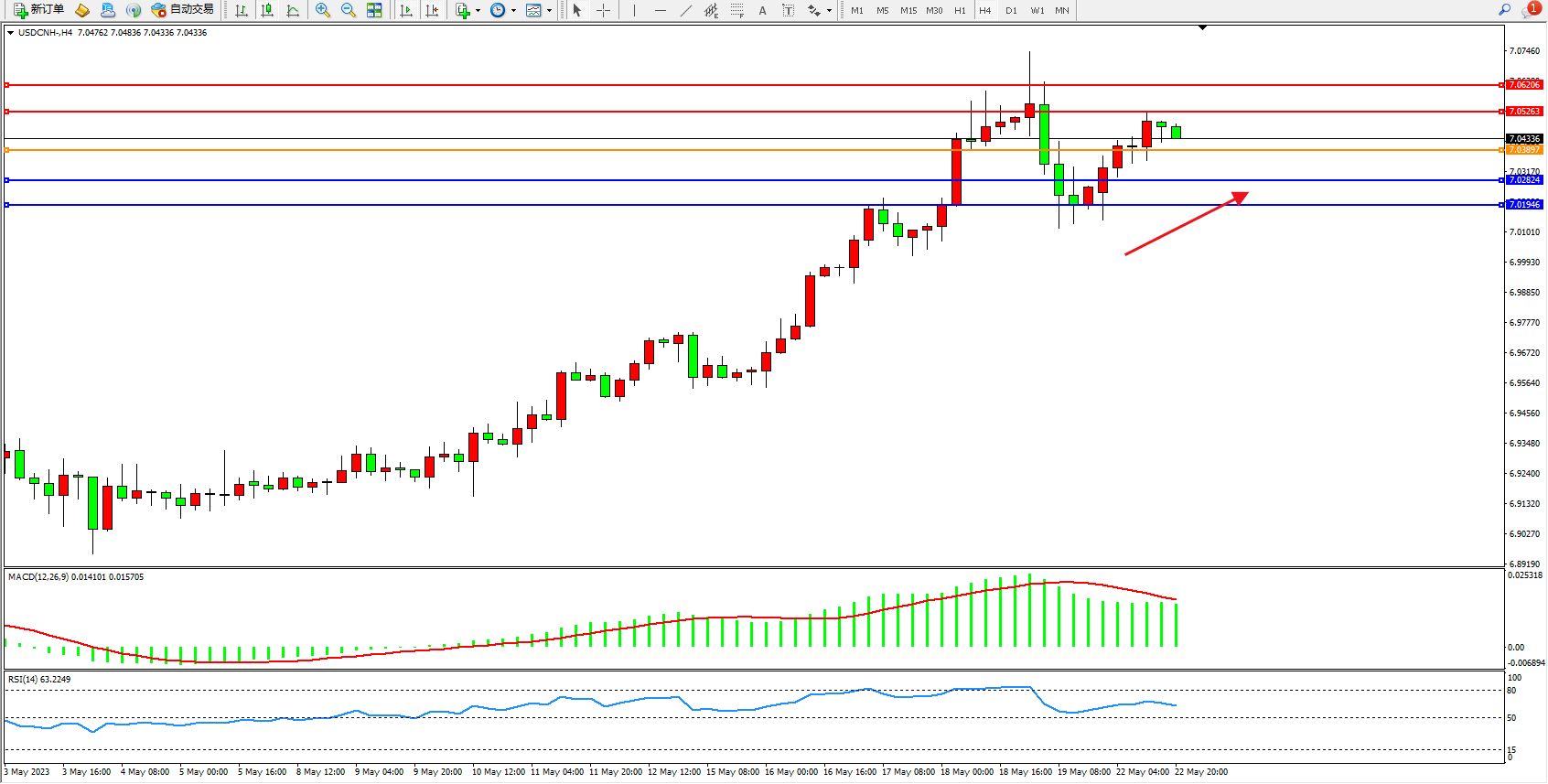美元人民币USDCNH——4小时K线图显示: