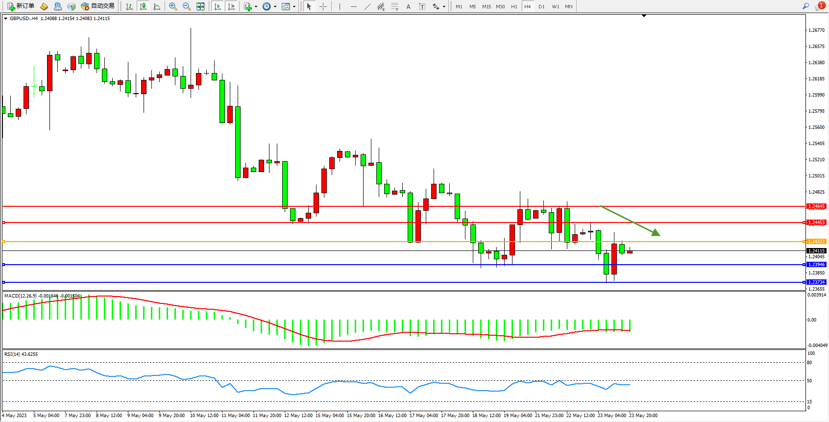 交易策略:1.24223下方看跌,目标1.23946 1.23734
