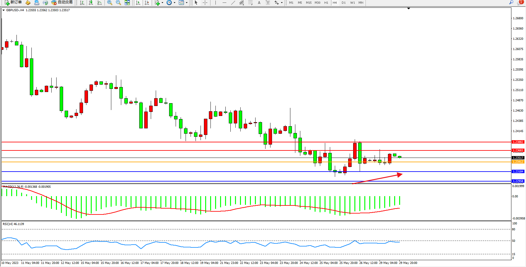 备选策略:1.23412下方看跌,目标1.23184 1.22958
