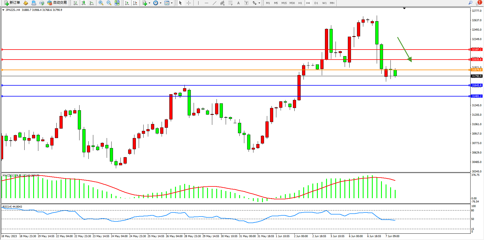 日经指数JPN225——4小时K线图显示:
