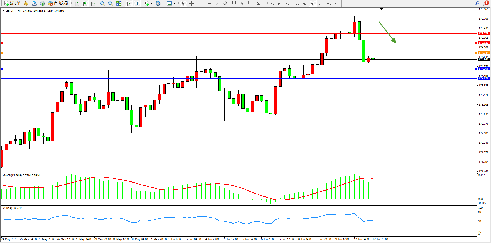 交易策略:174.739下方看跌,目标174.296  174.030