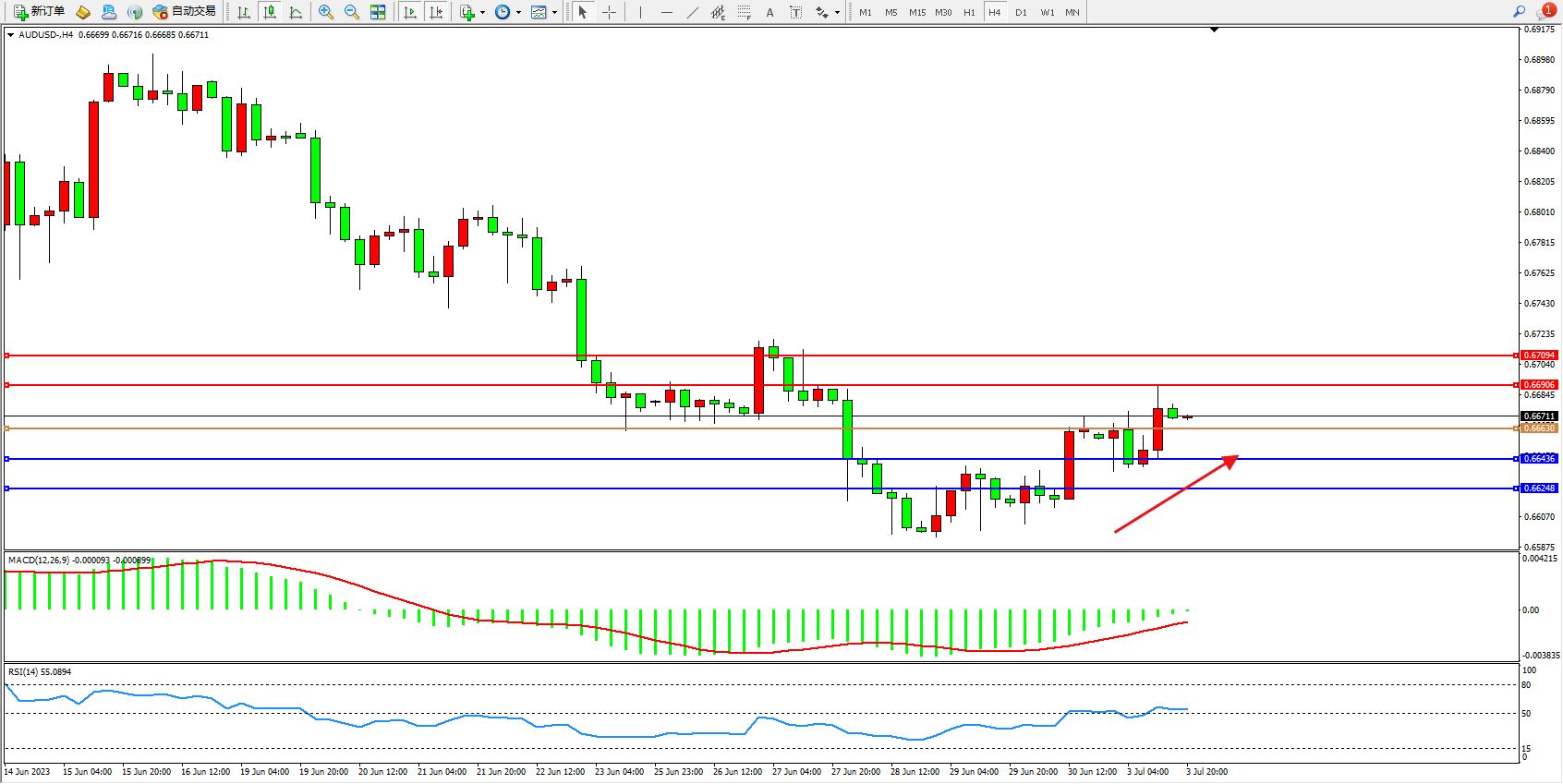 交易策略:0.66630上方看涨,目标0.66906 0.67094