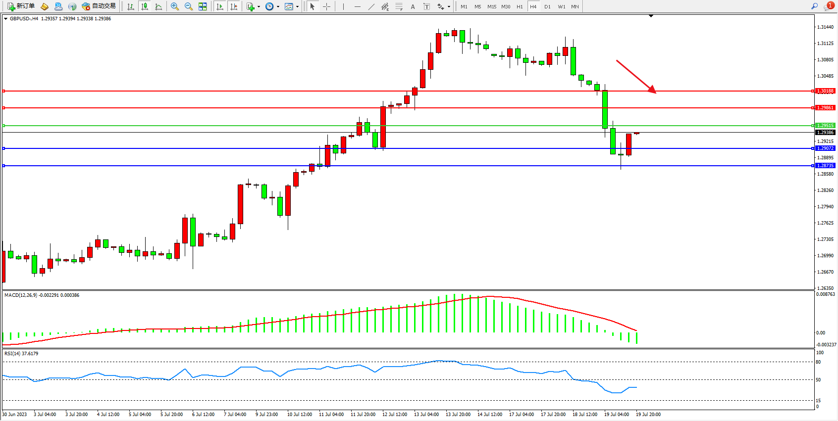 英镑美元GBPUSD ——4小时K线图显示: