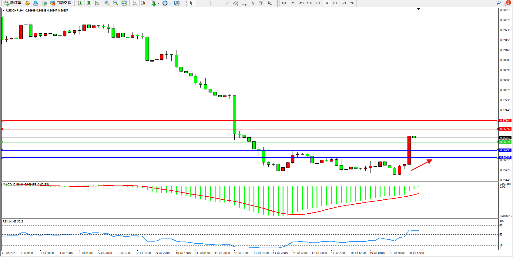 美元瑞郎USDCHF——4小时K线图显示: