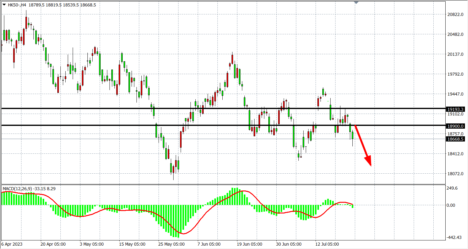 4小时图看,恒指在19000之下进一步走低,MACD量能下穿零轴,阻力下移18900附近,该位之下看跌18300-18000。