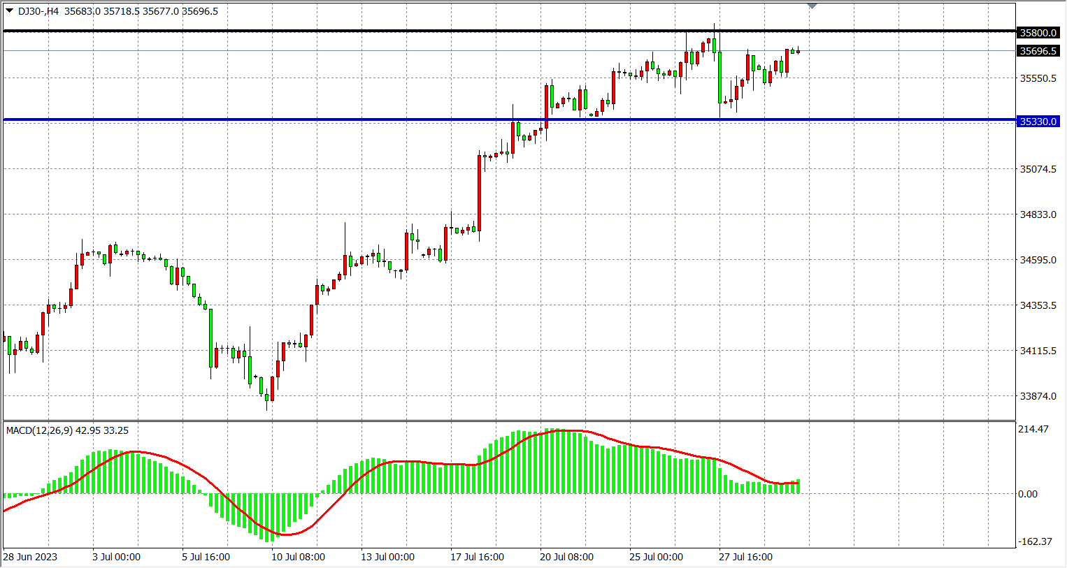 4小时图看,道指在高位35800受阻,同时在下方35330附近受支撑,MACD量能在零轴上缩量,行情进入高位盘整,支撑关注35330-35100附近,阻力35800-36000。