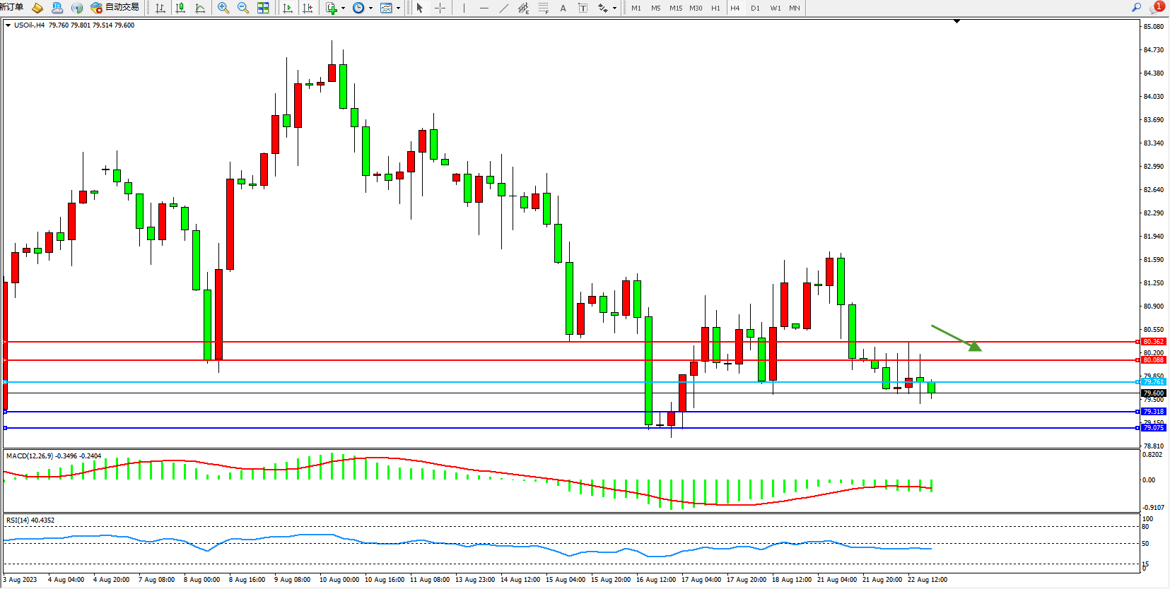 交易策略:79.761下方看跌,目标79.318  79.075