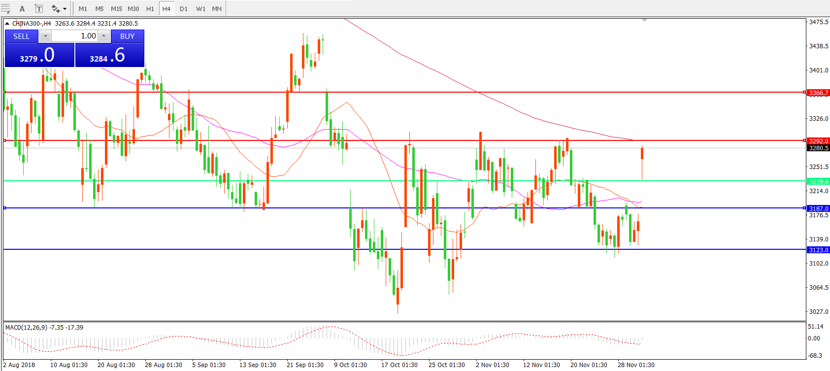 4 小时图看,CHINA300中华指数跳空高开,站稳3187一线后收出锤子线形态,短期走势偏强,MACD绿柱逐渐缩短,重点关注上方3292一线阻力。