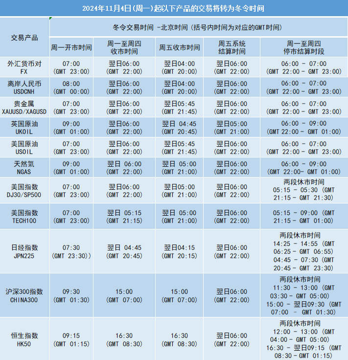 因应欧洲时区于2024年10月27日(周日)及美国时区于2024年11月3日(周日)开始分别转为冬令时间, 本公司各产品交易时间将调整为冬令时间,敬请留意。