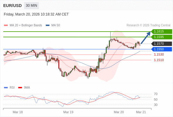 在 1.1550 之上,看涨,目标价位为 1.1595 ,然后为 1.1615 。