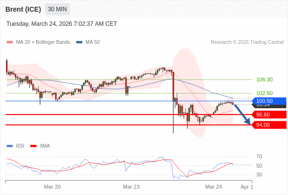 交易策略: 在 100.50 之下,看跌,目标价位为 96.80 ,然后为 94.00 。