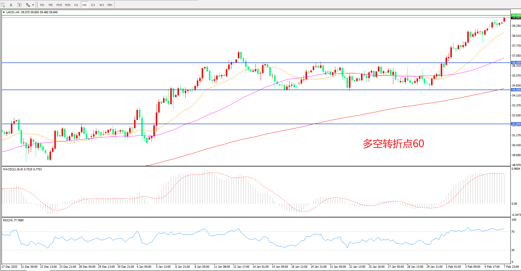 4小时图看,油价连续拉升,整体表现偏强,56.5阻力被快速突破,多头趋势已经形成,MACD红柱增加,RSI指标向上,日内延续上行概率较大。