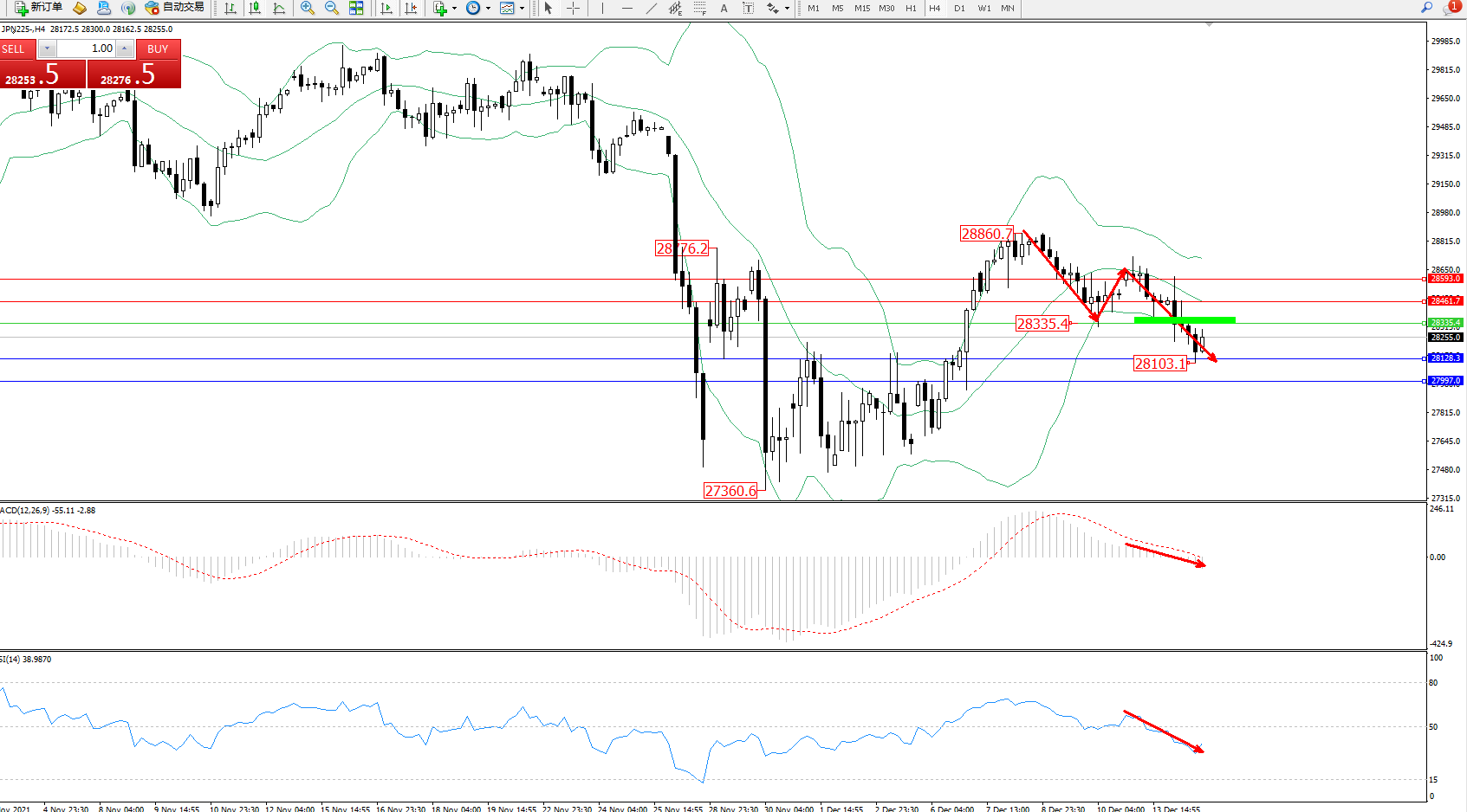 日经指数JPN225——4小时K线图显示: