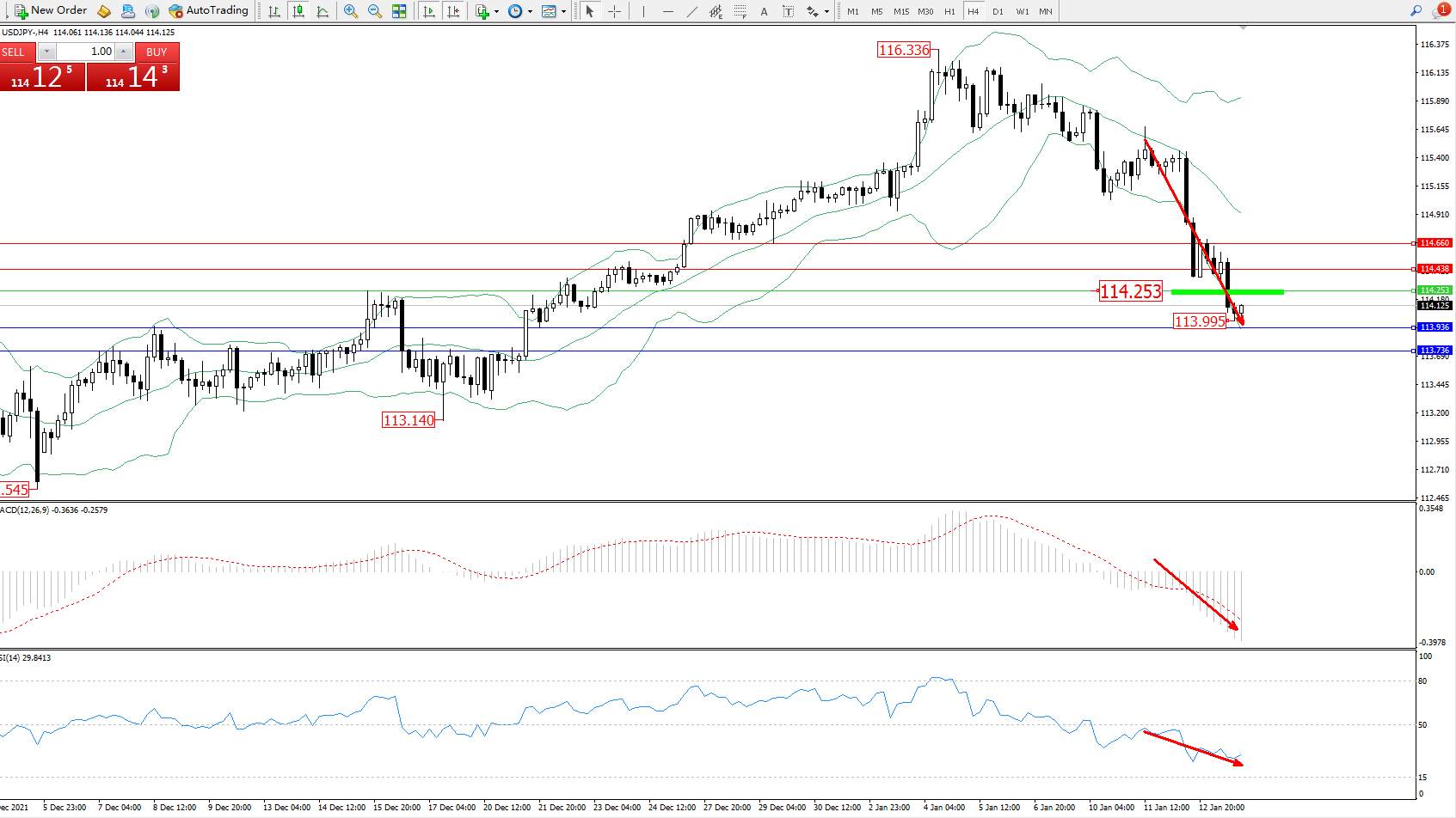 技术点评:空头动力延续布林带指标通道中下轨区间持续震荡下行,低位抵达113.995附近节点后开始震荡,短期空头动力有继续下行态势,布林带指标呈缓慢张口走势持续中,高位跌势并未有最终止步迹象,MACD指标处于空头区域维持震荡下行,RSI指标处于空头区域维持整理徘徊中;