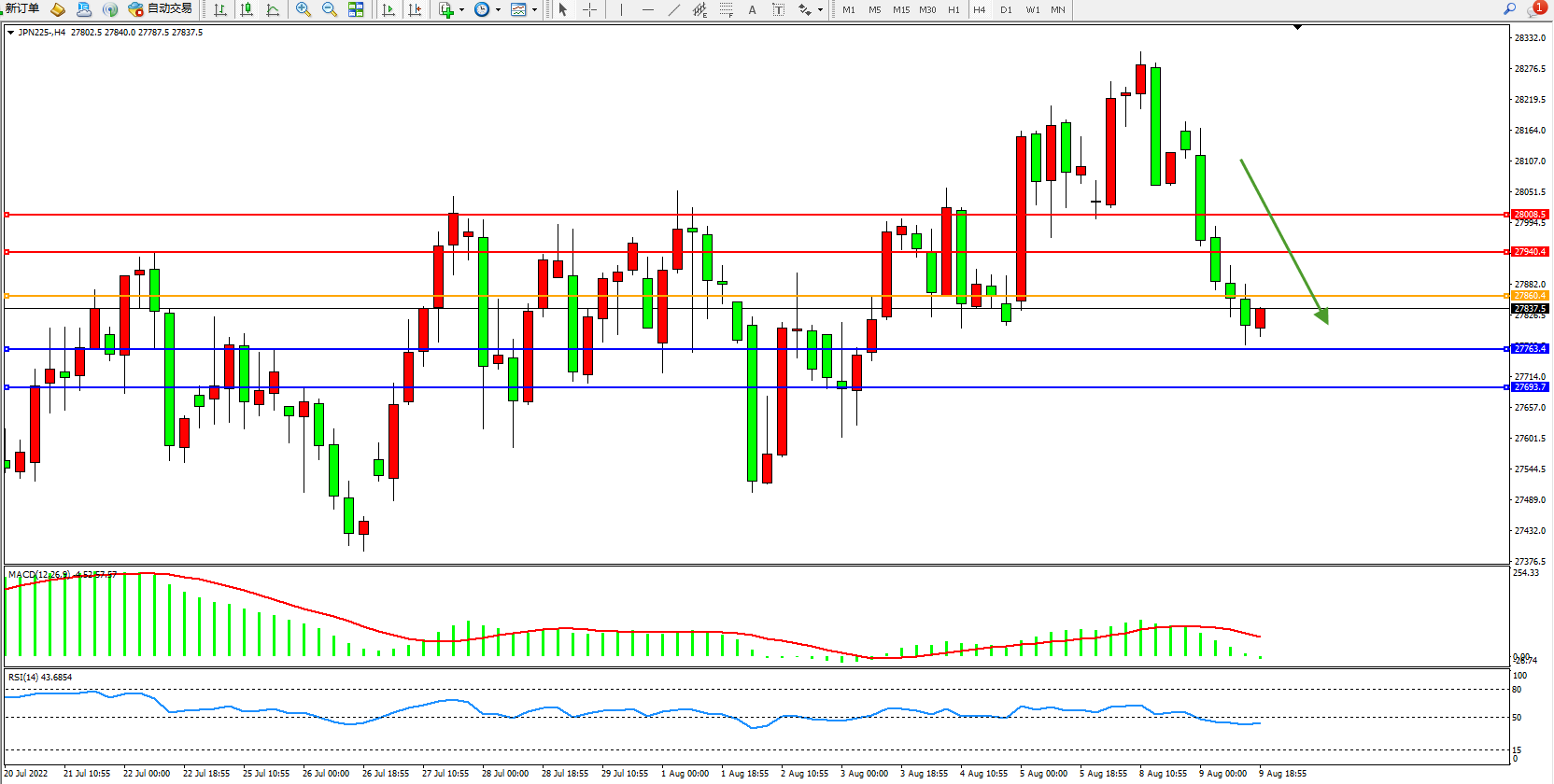 日经指数JPN225——4小时K线图显示: