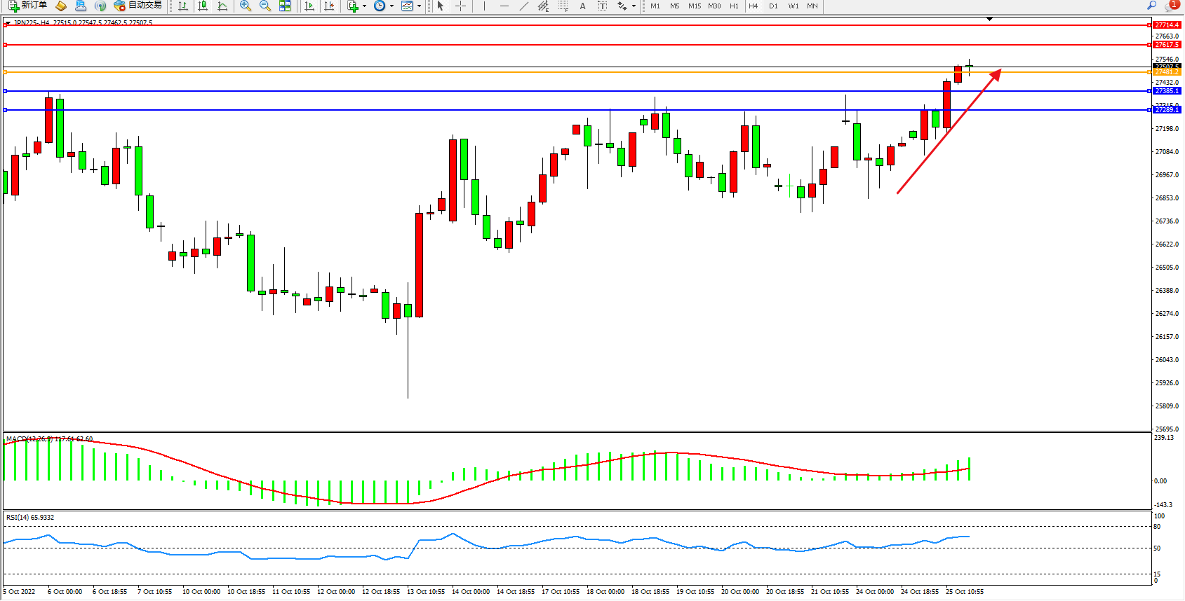 日经指数JPN225——4小时K线图显示: