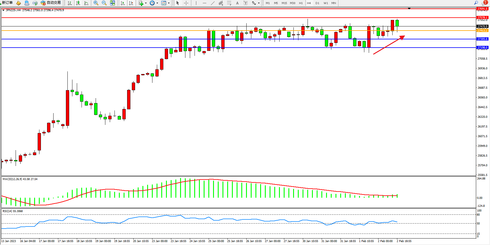 日经指数JPN225——4小时K线图显示: