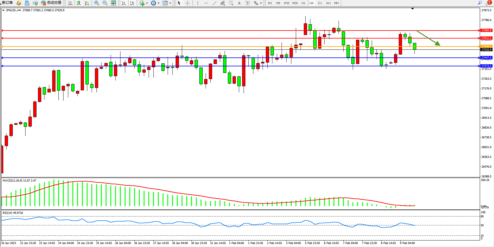日经指数JPN225——4小时K线图显示: