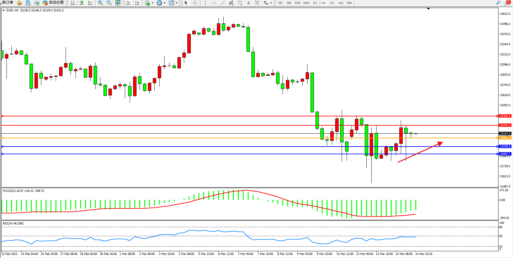 道琼斯指数DJ30——4小时K线图显示: