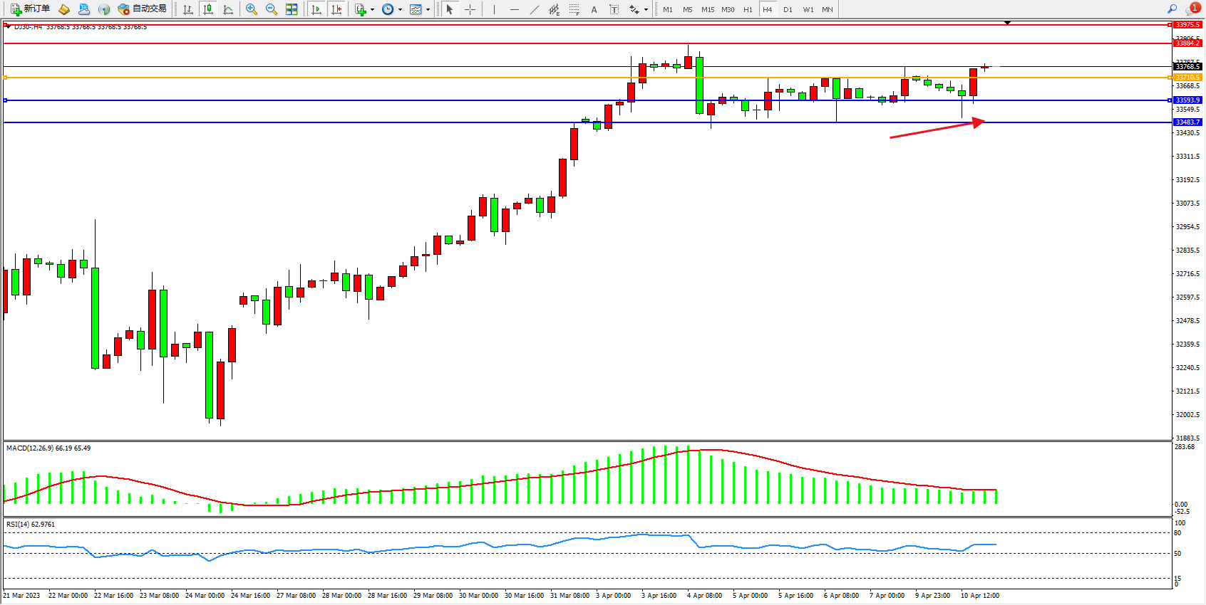 道琼斯指数DJ30——4小时K线图显示:
