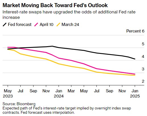 由于上周五美国在假期缩短的交易时段公布了强劲的就业数据,交易员提高了美联储5月份再次加息25个基点的可能性。与美联储会期挂钩的互换合约定价表明,美联储在5月3日将政策利率区间上调至5%-5.25%的可能性超过80%。5月份的合约利率上升至略高于5.03%,较上次加息以来的有效政策利率高出20个基点。
