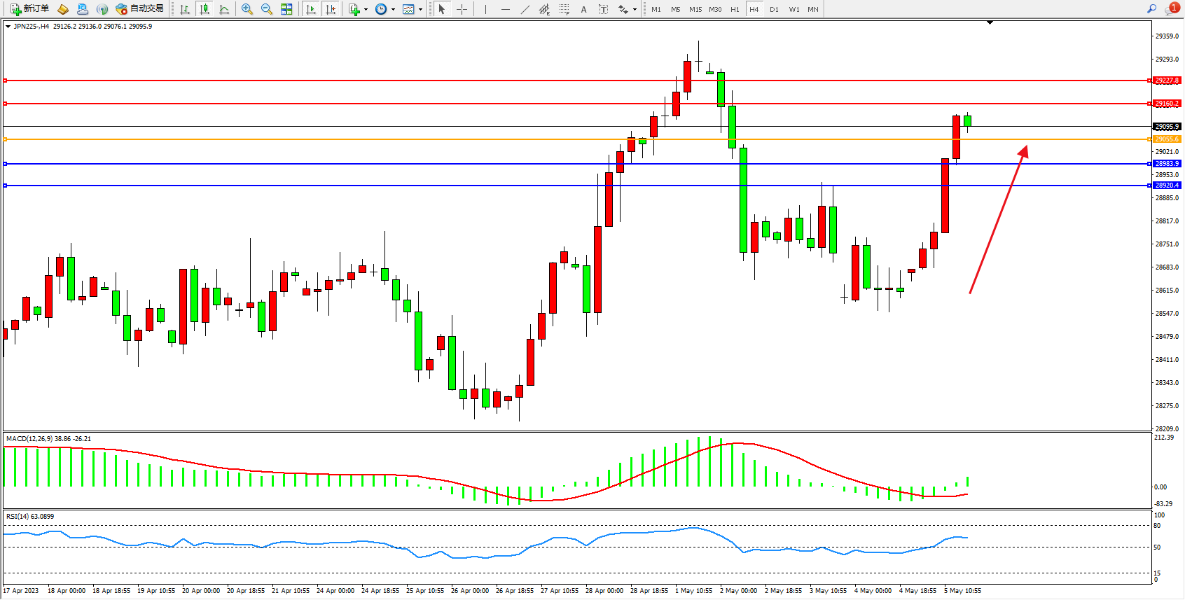 日经指数JPN225——4小时K线图显示: